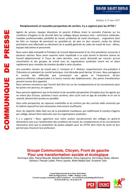 Aujourd’hui et demain, ces personnels techniques sont en grève. Ils étaient rassemblés ce matin devant l’Hôtel du département pour rappeler leurs conditions de travail, les difficultés qu’ils rencontrent dans l’exercice de leurs missions et en appeler au Département, leur employeur. Pierre Laporte et moi-même sommes allés leur apporter notre soutien. J’y ai retrouvé des agents du collège Jean-Jaurès de Montfermeil. Personnels et parents d’élèves connaissent mon engagement et l’attention que je porte à ce dossier.